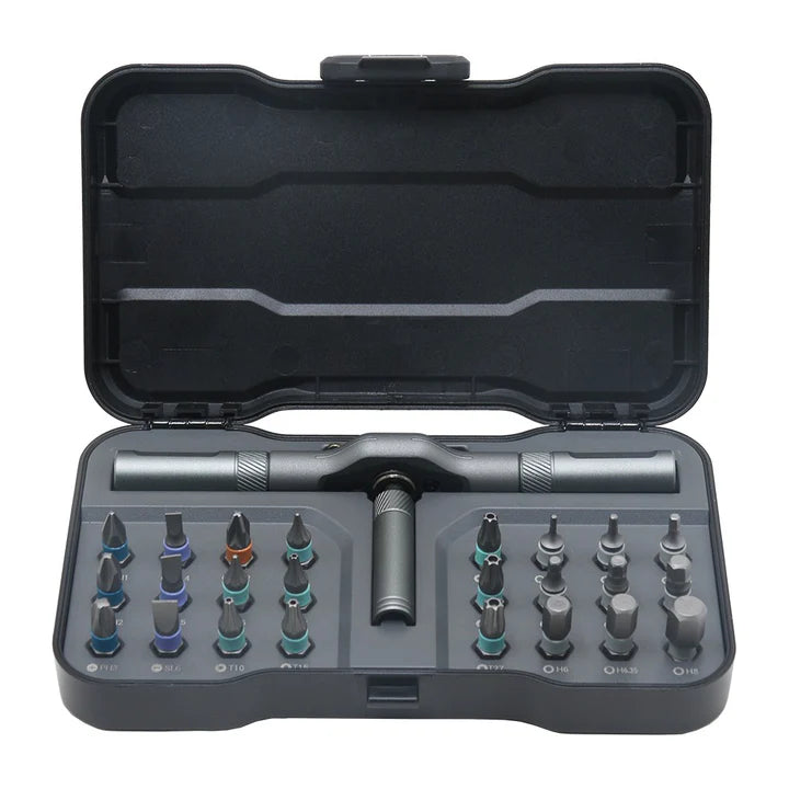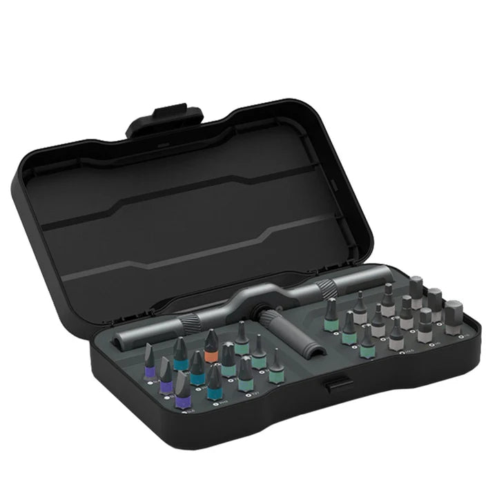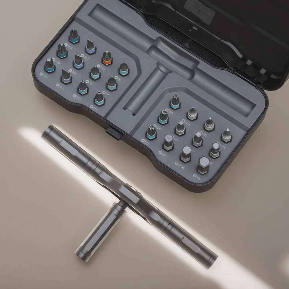 El set MYJ 24-en-1 integra una llave de trinquete compacta con almacenamiento magnético y 24 puntas de acero S2 de uso intensivo. Su cuerpo metálico y carraca de alta precisión permiten trabajar en espacios reducidos con control y torque constantes. Es el kit ideal para armado de muebles, mantenimiento del hogar, bici, electrónica y más, todo en un estuche minimalista que cabe en cualquier cajón o mochila.